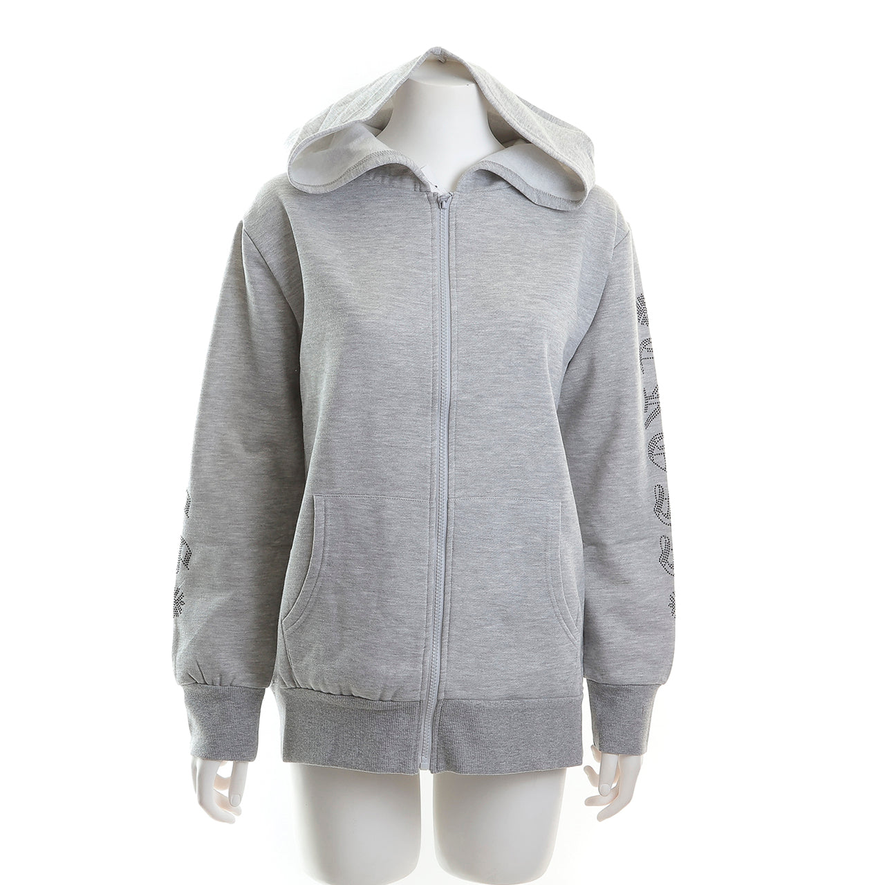 裏起毛 ラインストーンスタッズ ジップアップフーディー(ロゴデザイン、グレー)