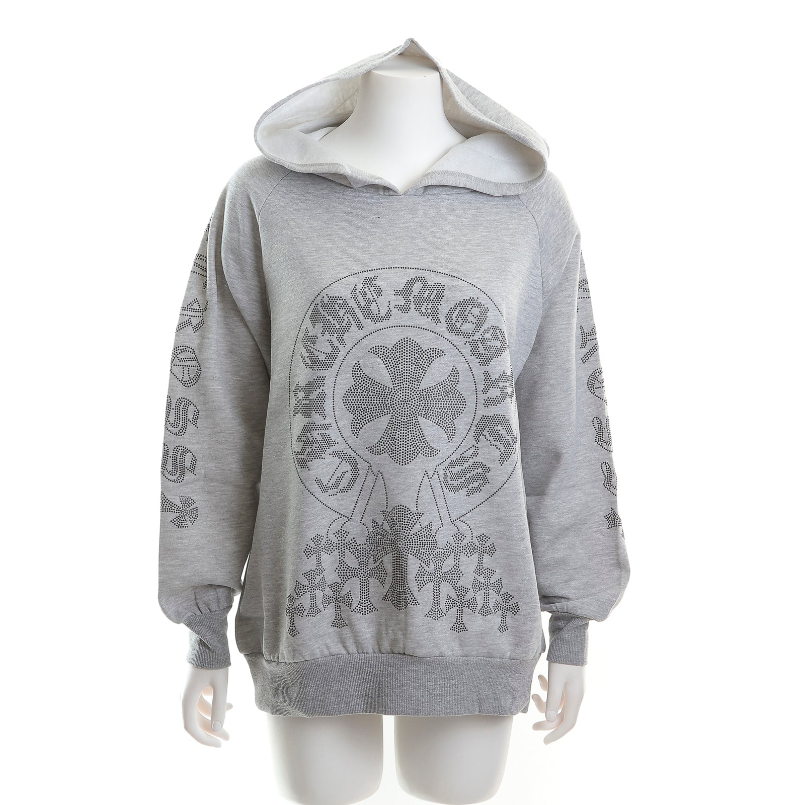 落ち着きのあるグレーボディに、サークルクロスモチーフのゴールドラインストーンをあしらったフーディー。