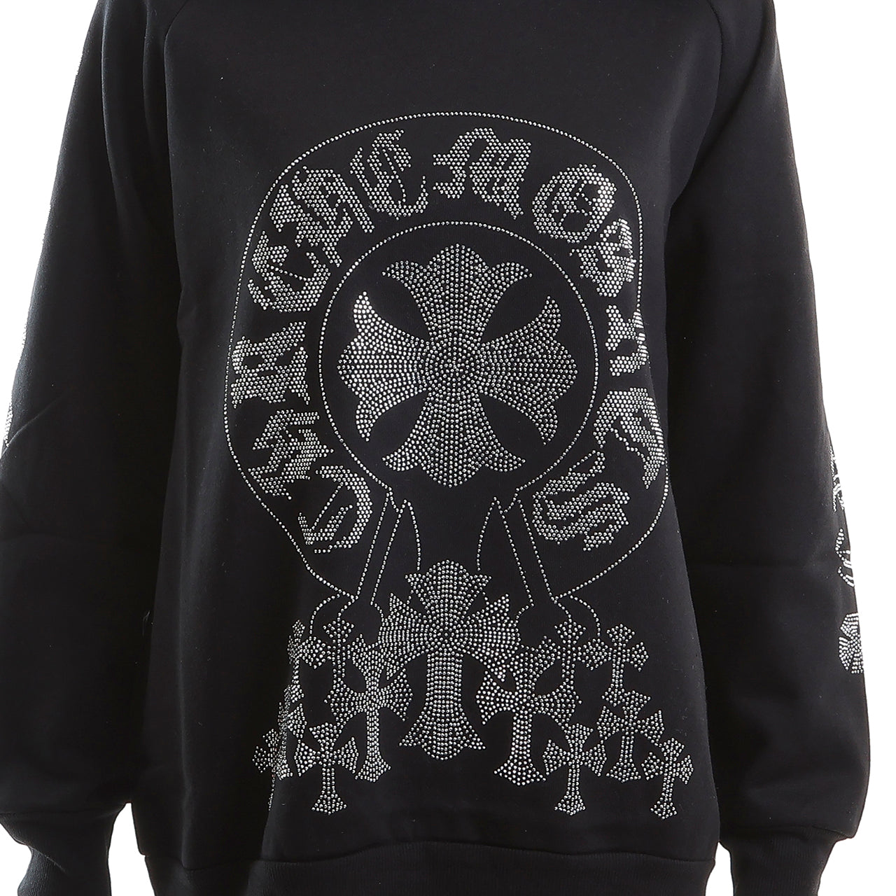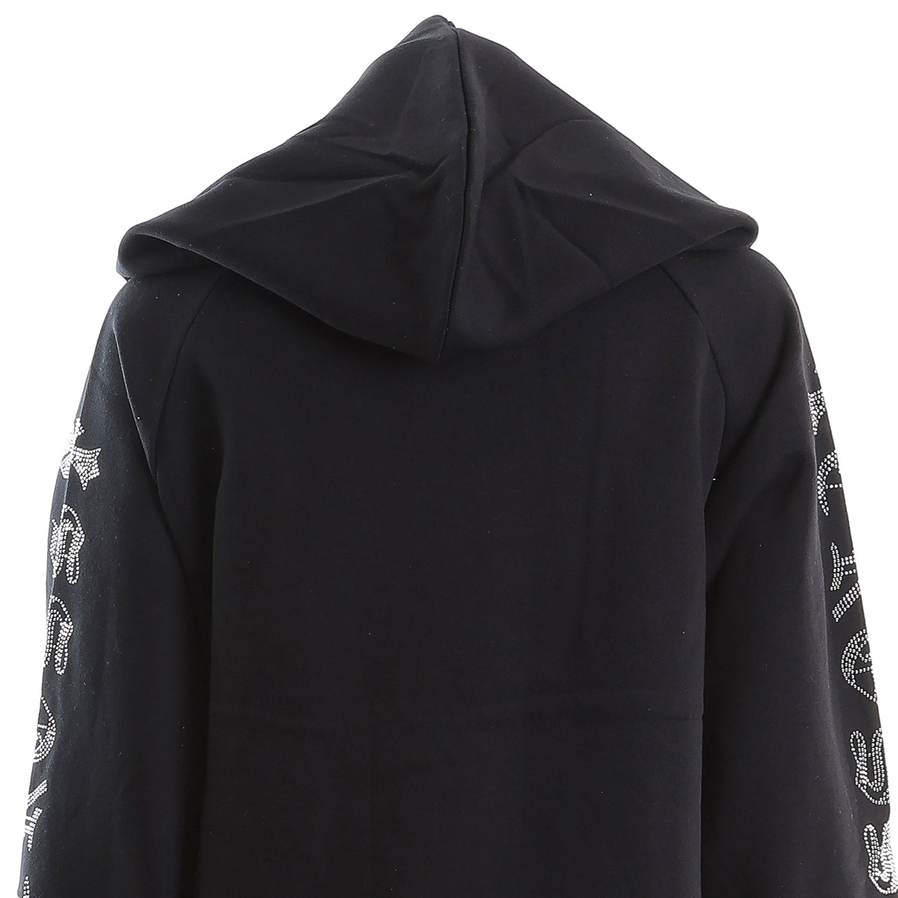 ブラックボディに、サークルクロスモチーフのゴールドラインストーンをあしらったフーディー。