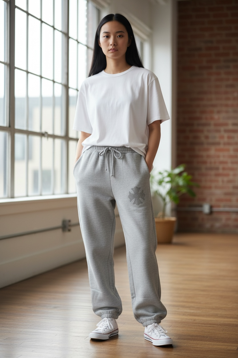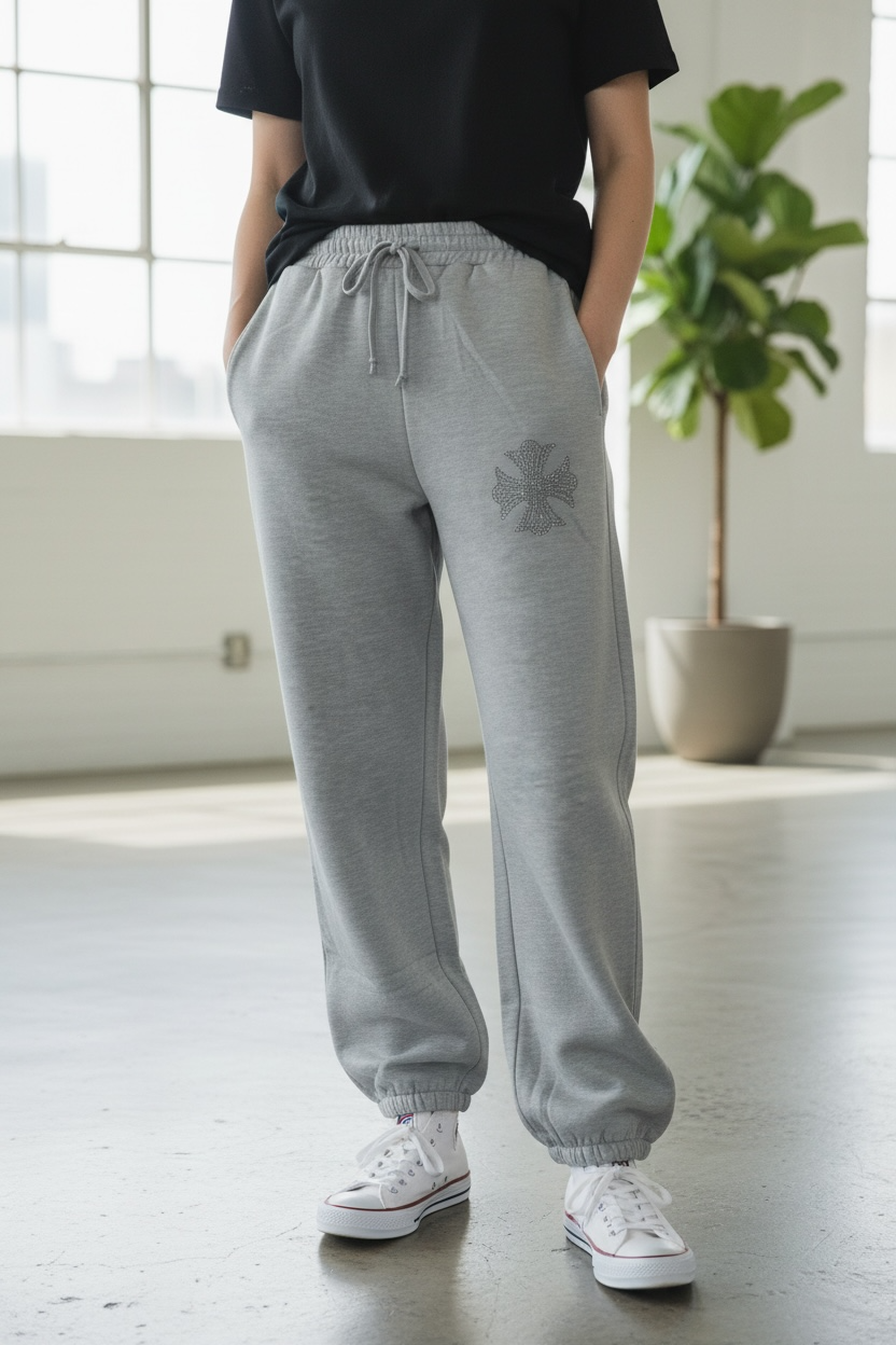 落ち着きのあるライトグレーに、クロスモチーフのゴールドラインストーンをあしらったロングパンツ。