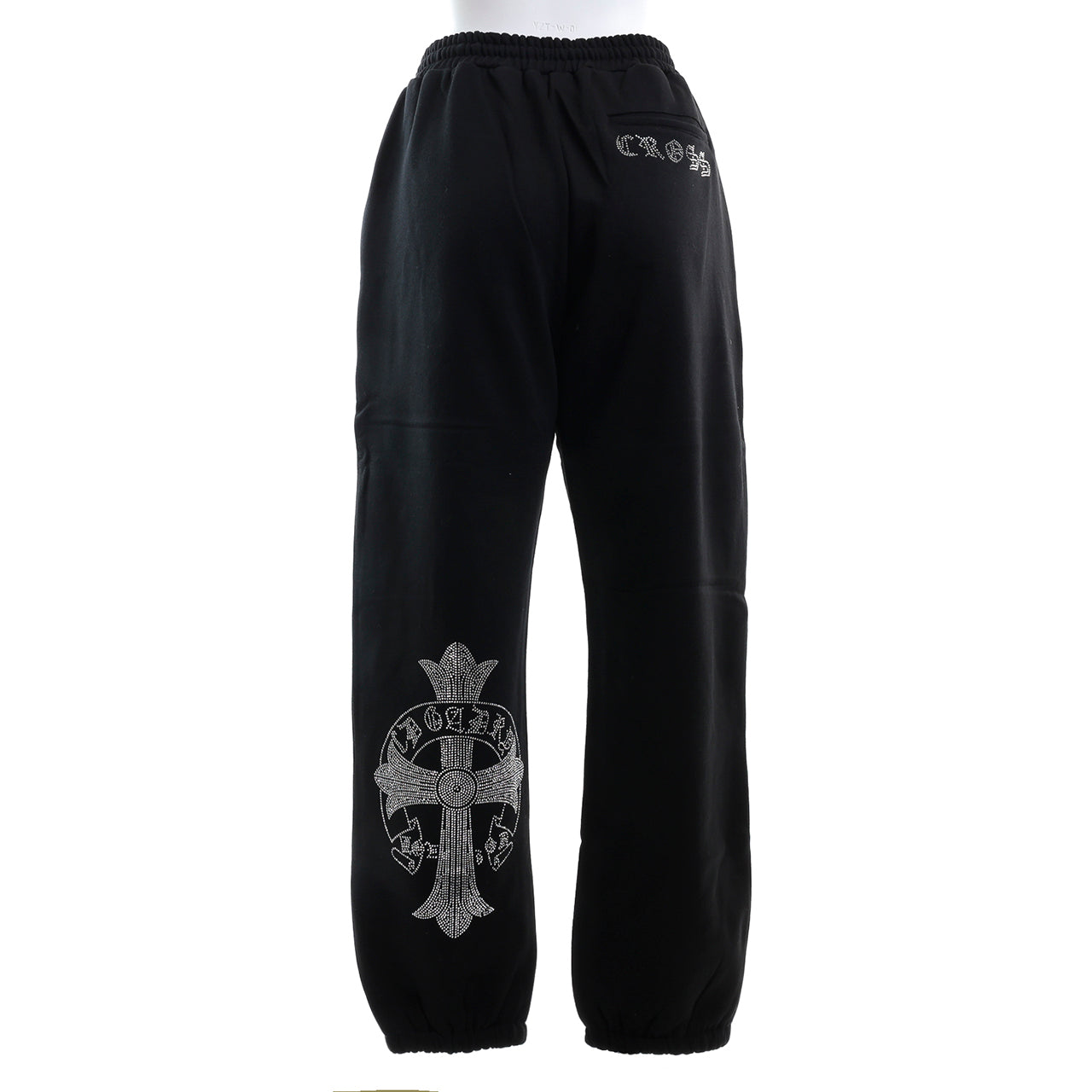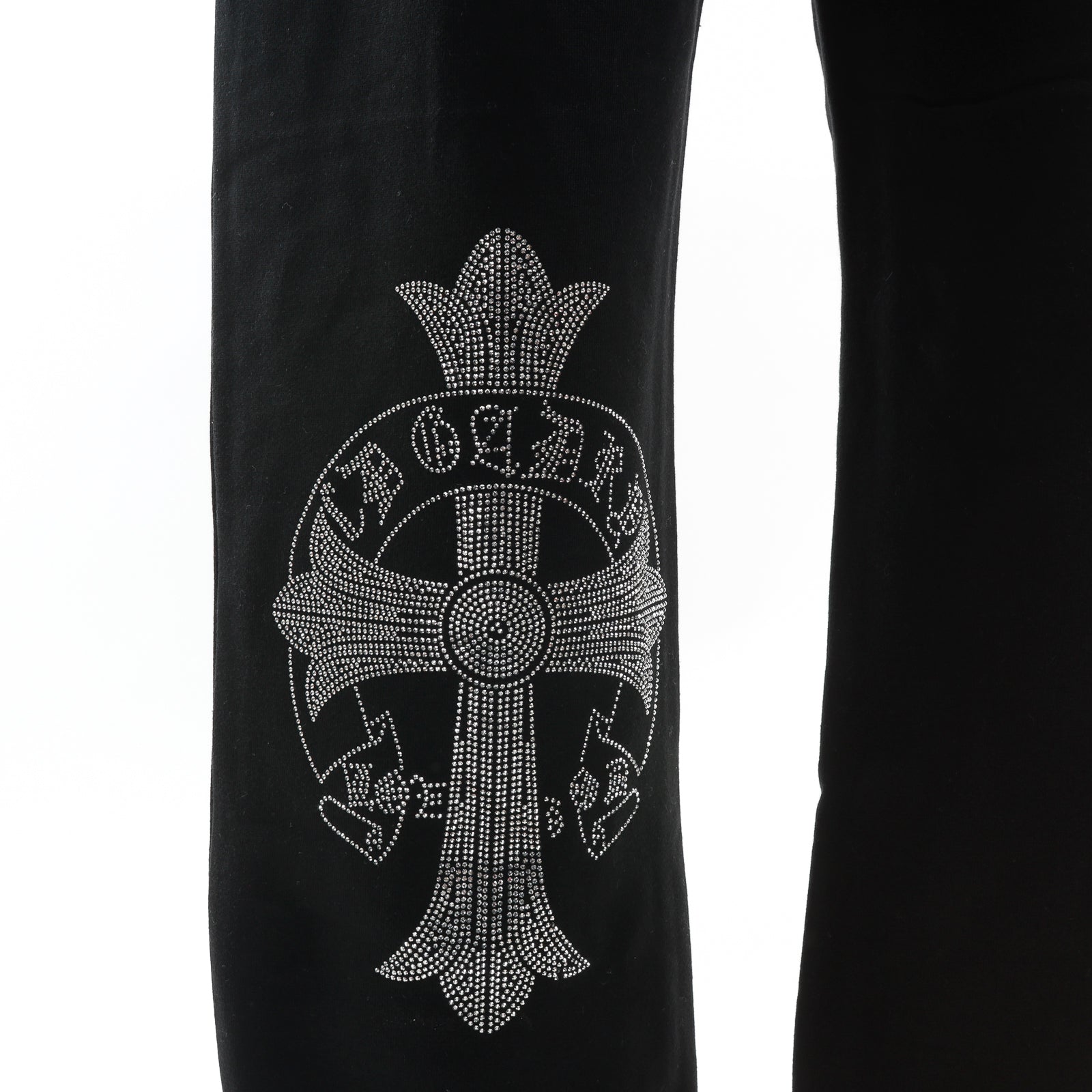 ブラックベースに、クロスモチーフのゴールドラインストーンが映えるロングパンツ。